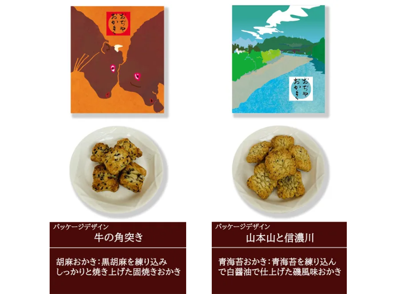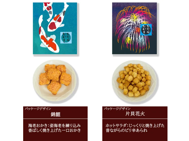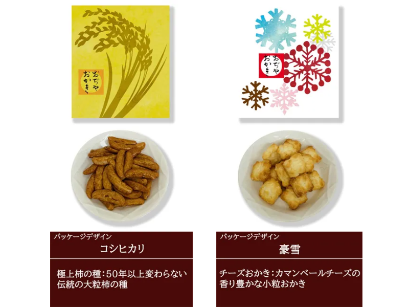 竹内製菓こだわりの「あられ・おかき」から厳選したものを、小千谷を代表する名産をモチーフにしたパッケージで包みました。見た目も華やかな米菓の詰め合わせです。