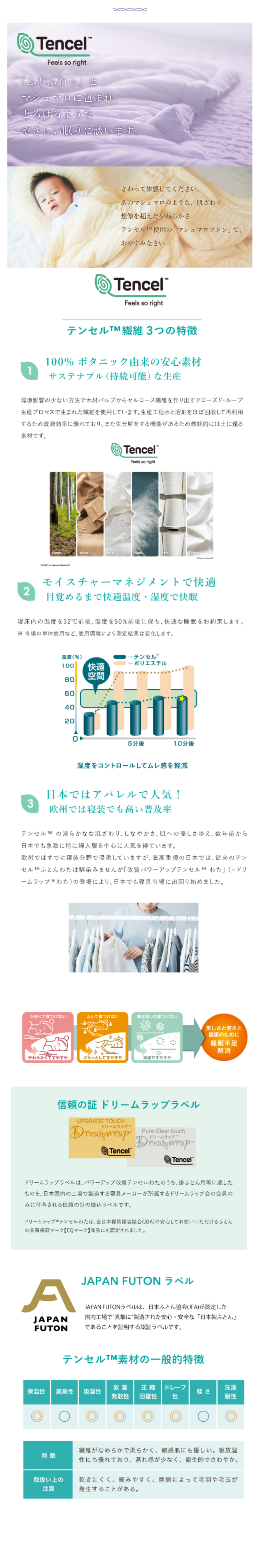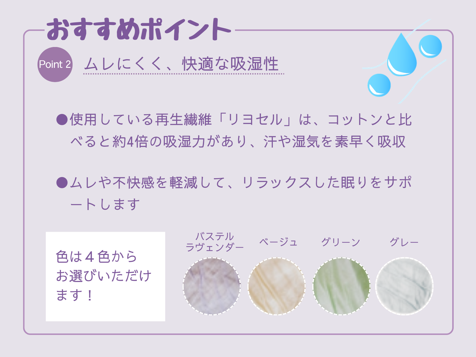コットンの約4倍の吸湿性で寝ている間の湿気や汗を吸収。